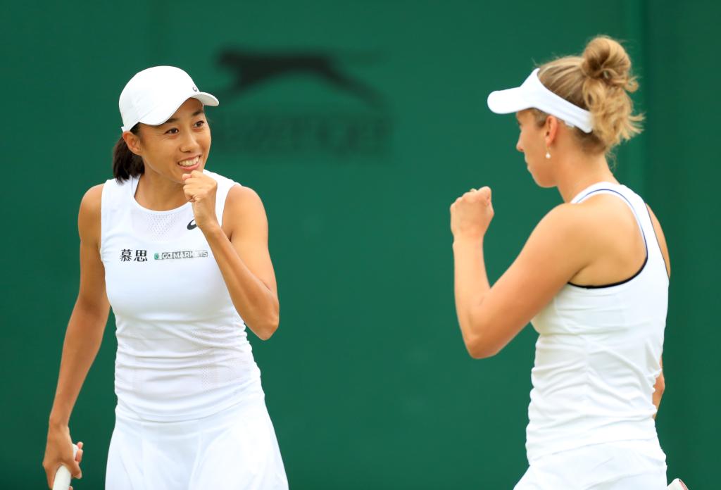 7月6日,张帅(左)/梅尔滕斯在比赛中庆祝得分。新华社记者李颖 摄