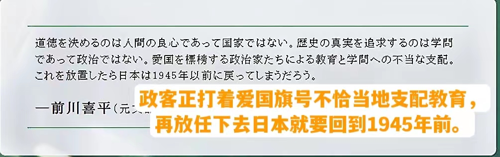 曾任日本文部科学事务次官的前川喜平留言:“政客正打着爱国旗号不恰当地支配教育,再放任下去日本就要回到1945年前。”