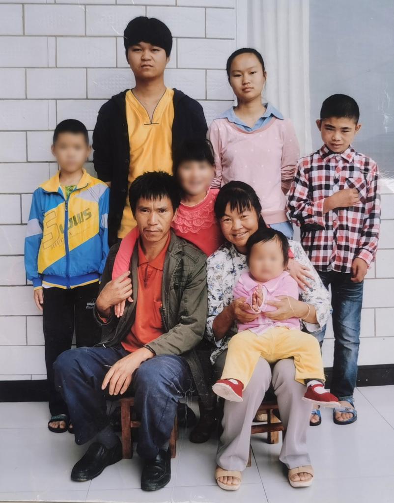 阿彬(右一)小时候,曹丽琼和丈夫带着自己的儿子(上左)、女儿(上右)与阿彬和其他三个寄养孩子在家合影。