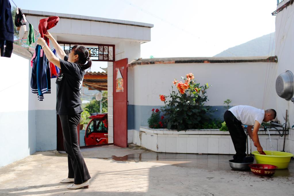 阿彬在家帮着妈妈曹丽琼洗衣服。