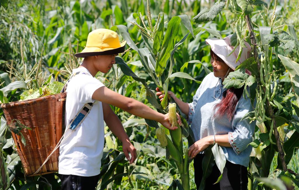 阿彬帮着妈妈在地里摘玉米。