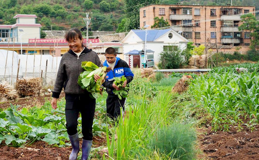 阿彬和妈妈在地里摘菜后的合影。