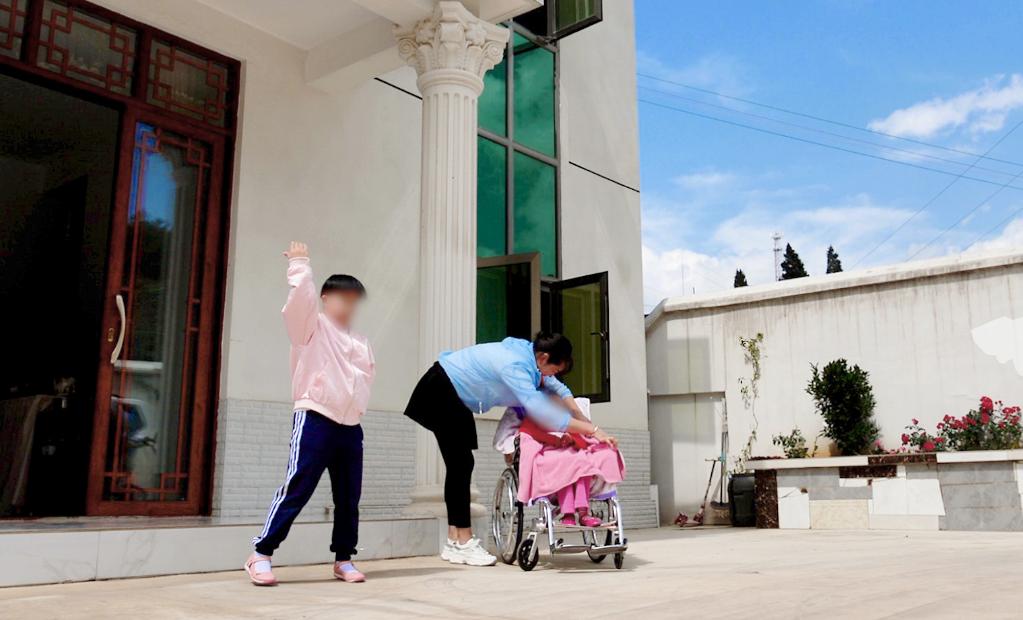 寄养妈妈李春美陪伴两个女儿在院子里晒太阳、玩耍。