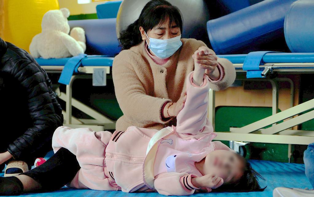 一位寄养妈妈在村里的康复中心为患脑瘫的女儿做康复锻炼。