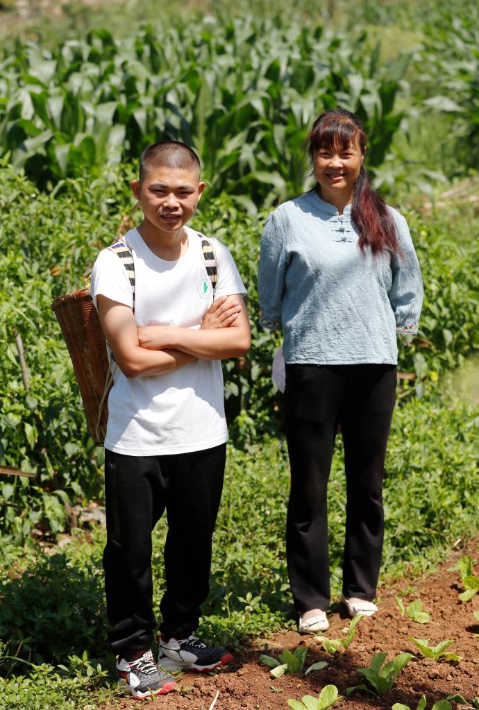 有智力障碍的阿彬,在父母教育下,如今已基本能生活自理,还能做一些不太重的家务农活。和妈妈一起去地里摘菜时,他从不让妈妈背菜,总是抢着把背篓背在身上。