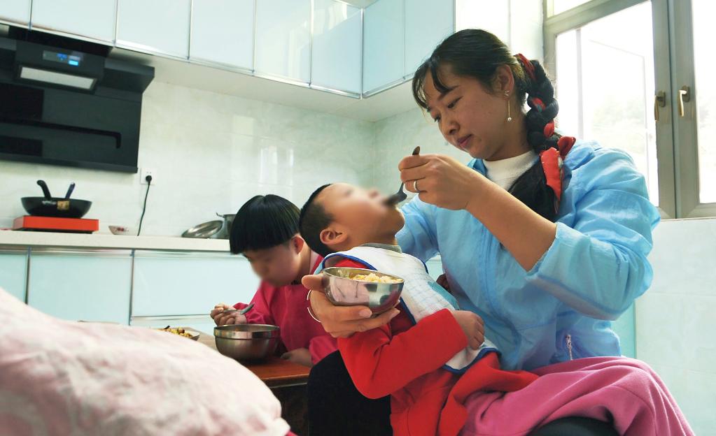 寄养妈妈李春美在给患脑瘫的女儿喂饭。