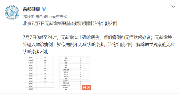 7月7日0时至24时,北京市无新增本土确诊病例、疑似病例和无症状感染者;无新增境外输入确诊病例、疑似病例和无症状感染者。治愈出院2例,解除医学观察的无症状感染者2例。