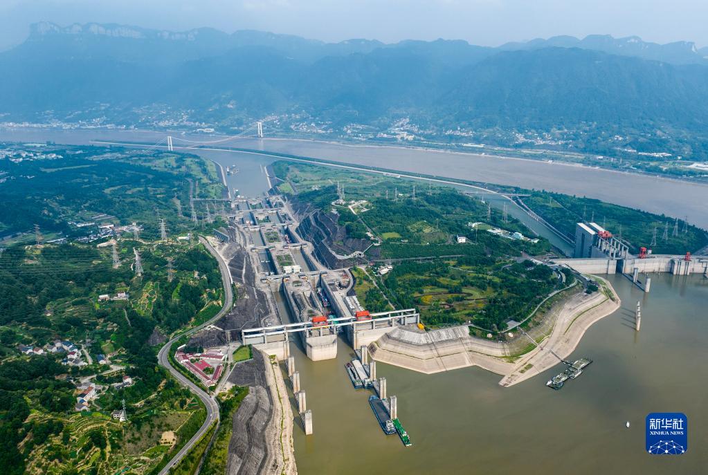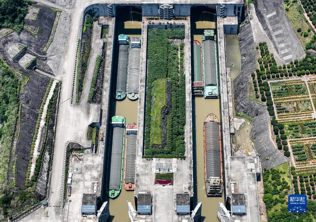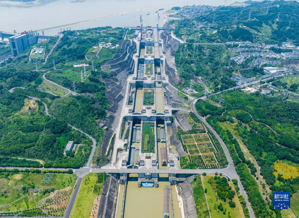 7月8日,船舶有序通过三峡五级船闸(无人机照片)。新华社发(郑家裕 摄)
