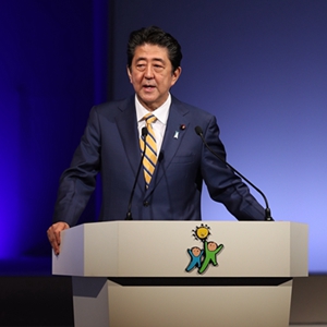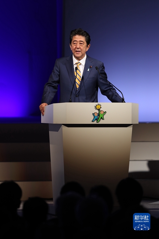 这是2019年2月10日,时任日本首相、自民党总裁安倍晋三在东京参加自民党大会的资料照片。新华社记者 杜潇逸 摄
