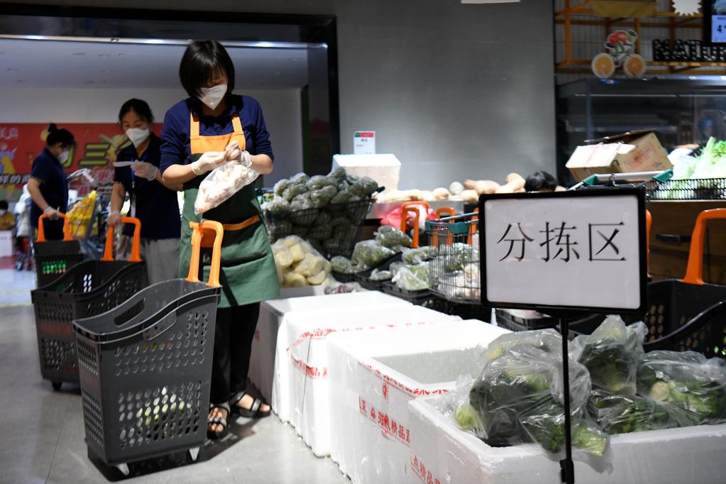 在泗县一家超市,工作人员根据线上订单分拣商品。 新华社记者 黄博涵 摄
