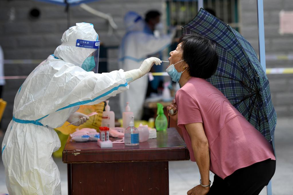 7月7日,在泗县桃李文苑小区,医务人员为小区居民进行核酸采样。新华社记者 黄博涵 摄