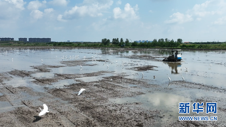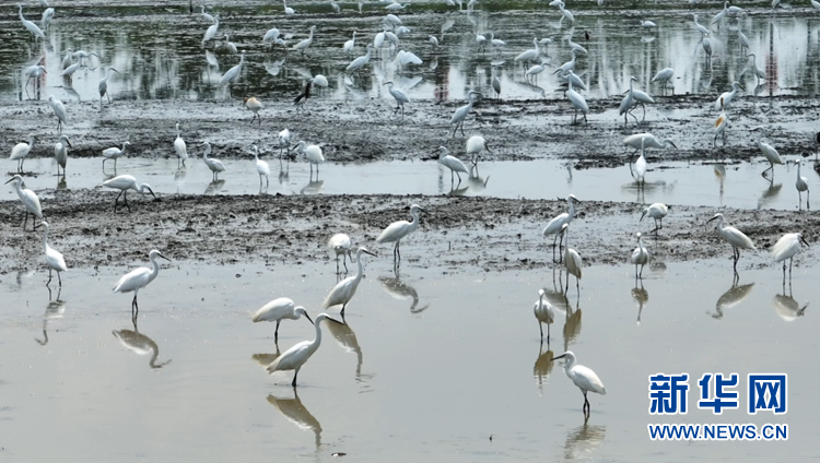 近日,在安徽省全椒县千佛庵村,成群的鹭鸟在刚刚翻耕过的水田里嬉戏觅食。近年来,全椒县大力推进生态文明建设,吸引大批白鹭等鸟类在此栖息,每逢夏种农忙,鹭鸟纷飞,构成了一幅人与自然和谐相处的美丽图画。