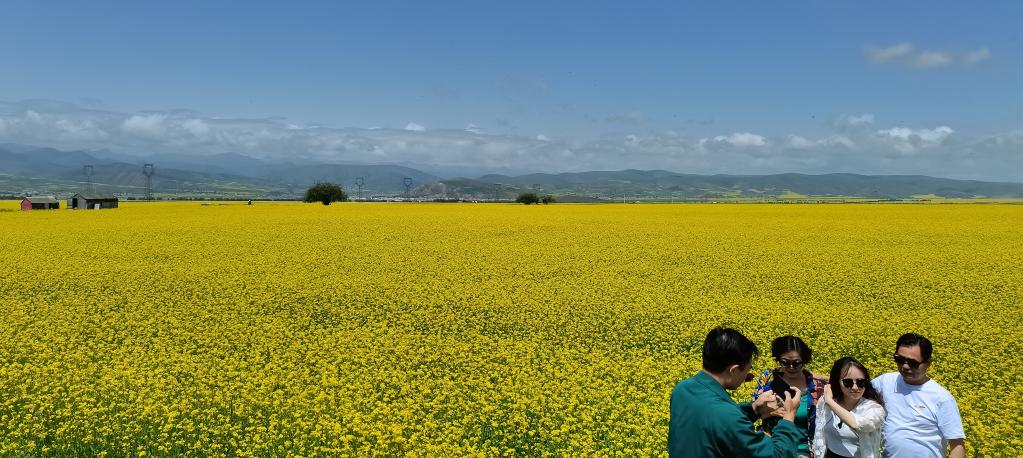 盛夏时节,从青海省会西宁出发,沿张汶高速公路驱车1个多小时,就进入门源回族自治县境内。油菜花铺展出“金色花海”,天地间融为一幅浓墨重彩的天然画卷。
