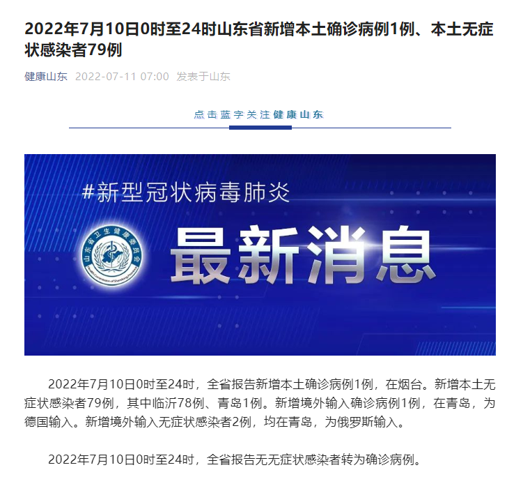 2022年7月10日0时至24时山东省新增本土确诊病例1例、本土无症状感染者79例
