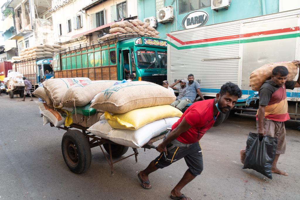5月21日,工人在斯里兰卡科伦坡贝塔市场搬运货物。(新华社记者唐璐摄)