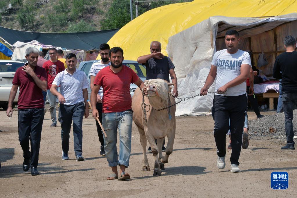7月9日,人们牵着牛走过土耳其安卡拉一处牲畜市场。西亚北非多国从7月9日开始宰牲节假期,然而持续的通货膨胀冲淡了节日氛围。人们无力举办传统庆祝仪式,商家销售惨淡,不少人直言这个宰牲节“不幸福”。新华社发(穆斯塔法·卡亚摄)