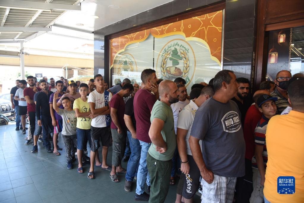 7月10日,人们在黎巴嫩的黎波里排队购买面包。西亚北非多国从7月9日开始宰牲节假期,然而持续的通货膨胀冲淡了节日氛围。人们无力举办传统庆祝仪式,商家销售惨淡,不少人直言这个宰牲节“不幸福”。新华社发(哈立德·哈巴什提摄)
