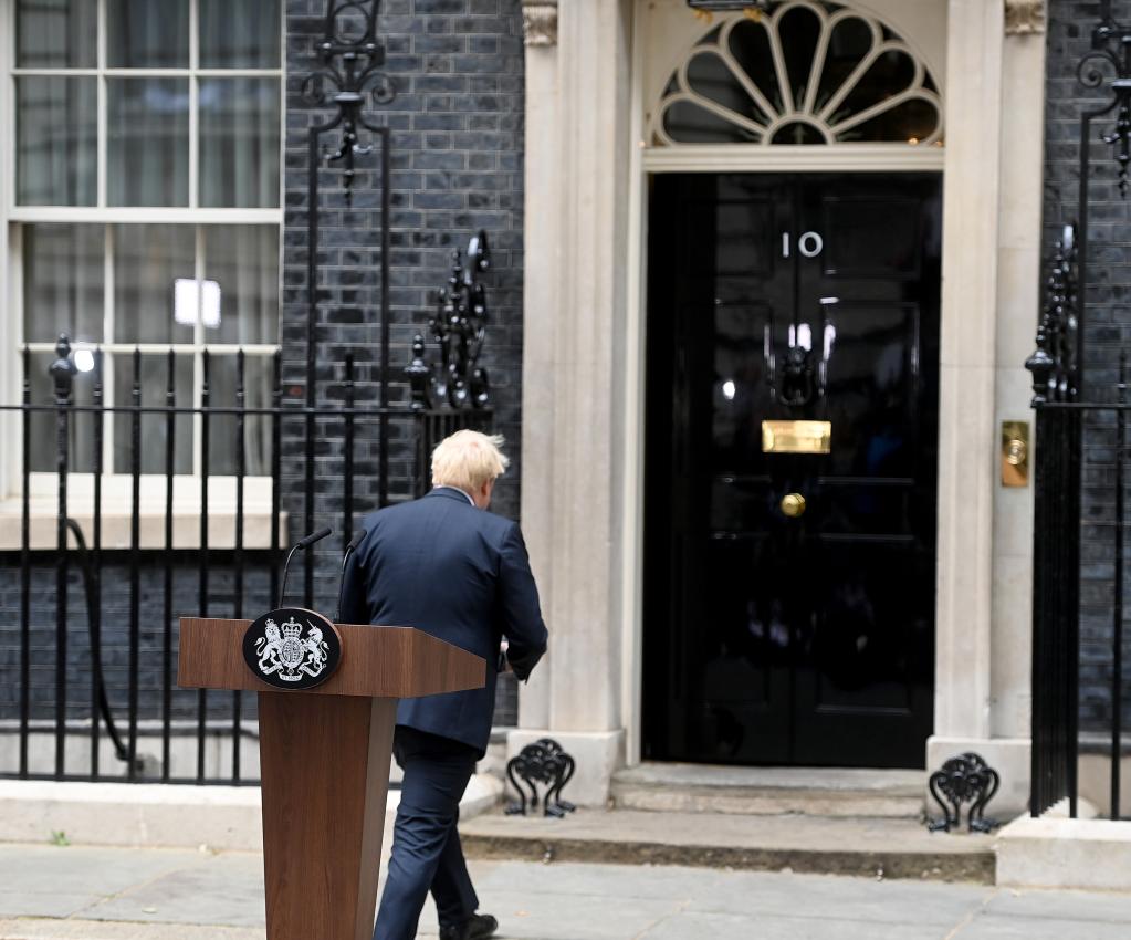 7月7日,英国首相鲍里斯·约翰逊在伦敦唐宁街10号门前发表讲话后离开。(新华社记者李颖摄)