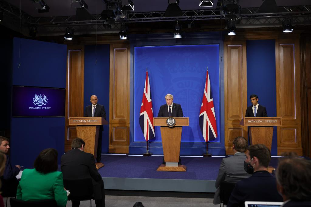 这是2021年9月7日,英国首相约翰逊(中)、时任卫生大臣贾维德(左)和时任财政大臣苏纳克在伦敦出席新闻发布会。新华社发(英国首相府供图)