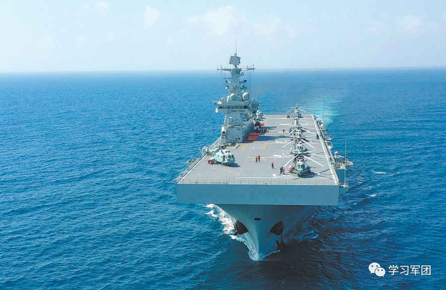 检验成果那天,多批多架次舰载直升机从海南舰甲板上腾空而起,标志着海南舰初步形成垂直投送能力。