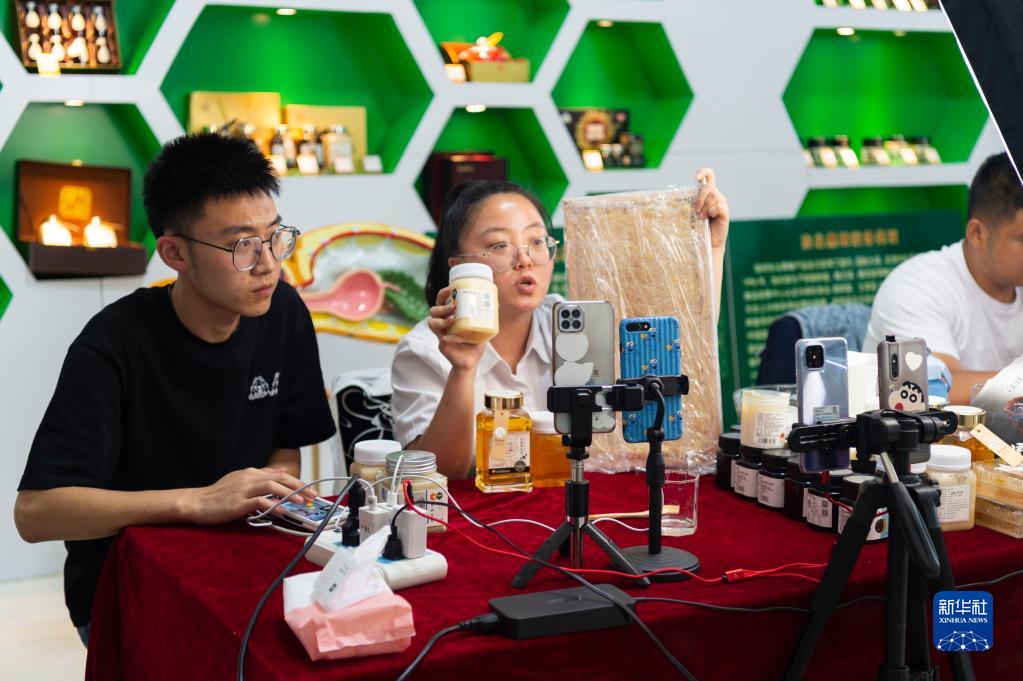 6月18日,在黑龙江省双鸭山市饶河县黑蜂产业园区,主播通过网络直播销售当地农副产品。 新华社记者 谢剑飞 摄