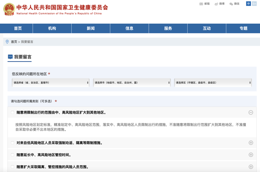 国家卫生健康委疫情防控“九不准”公众留言板留言界面截图