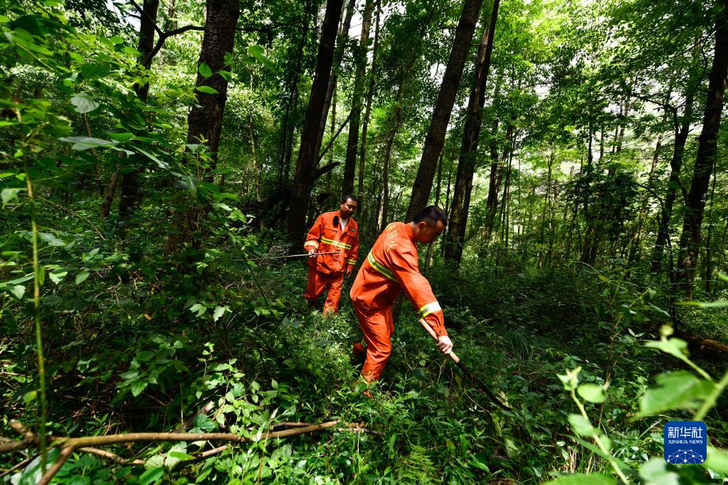 7月13日,在贵阳市长坡岭国家级森林公园,村级林长郭健(后)与护林员在公园林区巡护。 新华社记者 杨文斌 摄