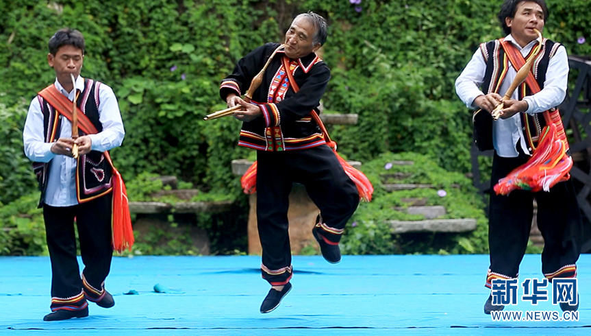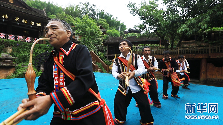 老达保村民在表演拉祜族芦笙舞(6月9日摄)。新华网 李浩 摄
