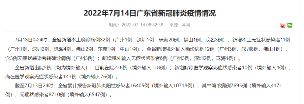 7月13日0-24时,广东省新增本土确诊病例32例(广州1例,深圳1例,珠海26例,佛山1例,茂名3例);新增本土无症状感染者11例(广州1例,深圳2例,珠海4例,佛山2例,东莞1例,中山1例)。全省新增境外输入确诊病例12例(广州3例,深圳8例,佛山1例),含3例无症状感染者转确诊病例(广州3例);新增境外输入无症状感染者6例(广州3例,深圳2例,珠海1例)。