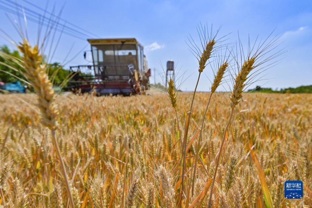 收割机在山东省青州市黄楼街道孙家村麦田里收获小麦(2022年6月7日摄)。新华社发(王继林摄)