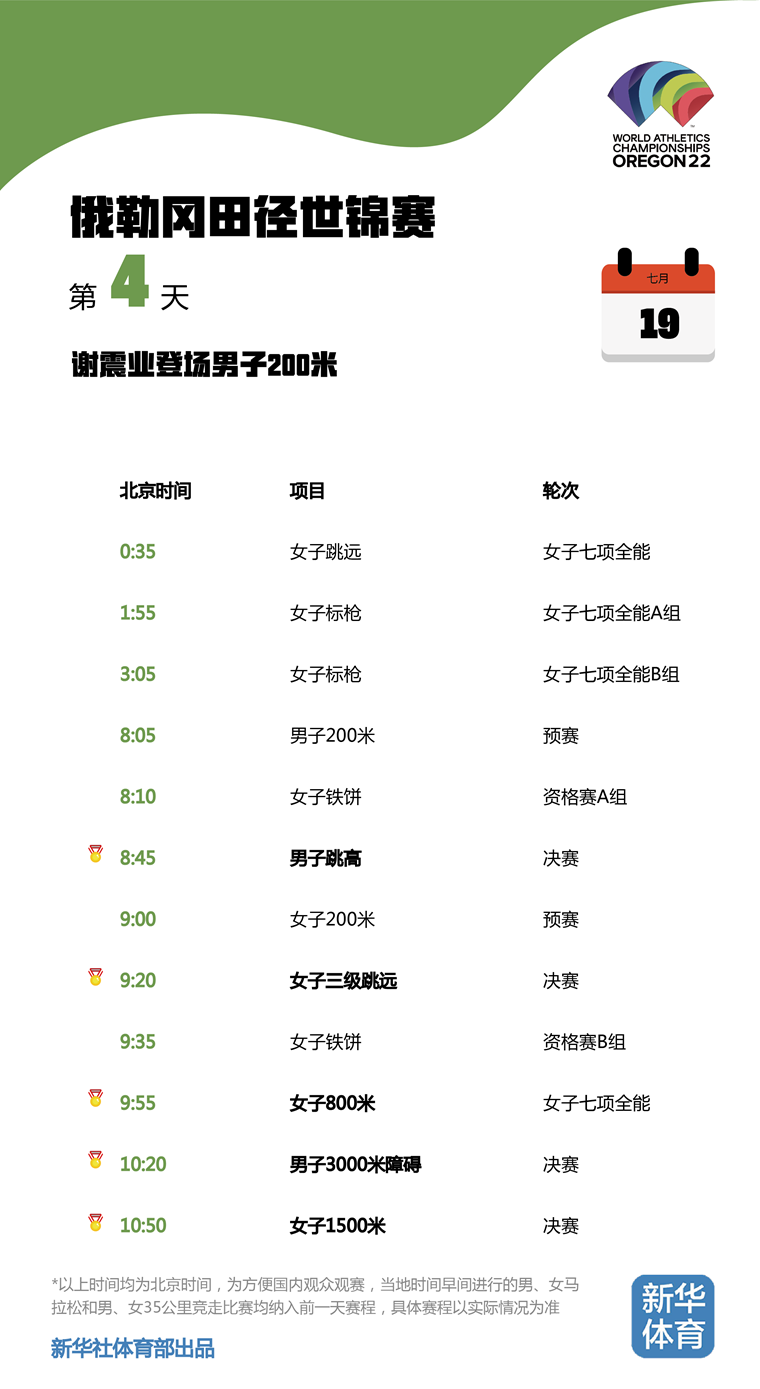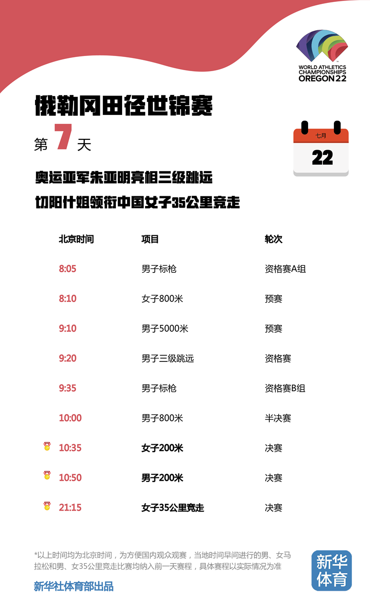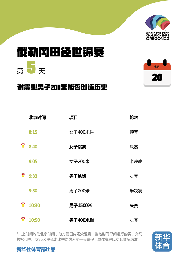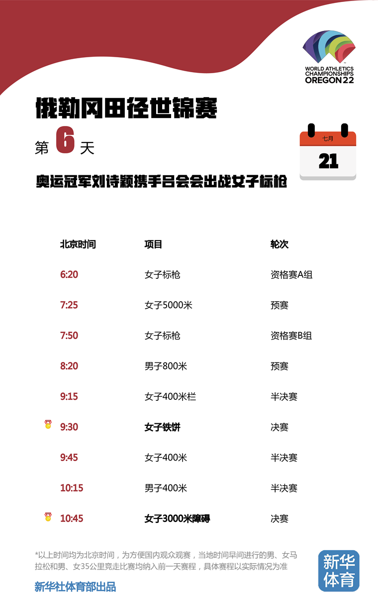 2022俄勒冈田径世锦赛将于当地时间7月15日至24日在美国俄勒冈州尤金市举行。由于比赛地与北京有15个小时的时差,为方便国内观众观赛,新华体育的小编们特意按照北京时间整理了一份世锦赛每日观赛时间表。日期、比赛时间统统都是北京时间!不用再去掰着手指头算时差,苏炳添、巩立姣等中国队名将每一轮比赛全部一目了然,快快收藏吧!