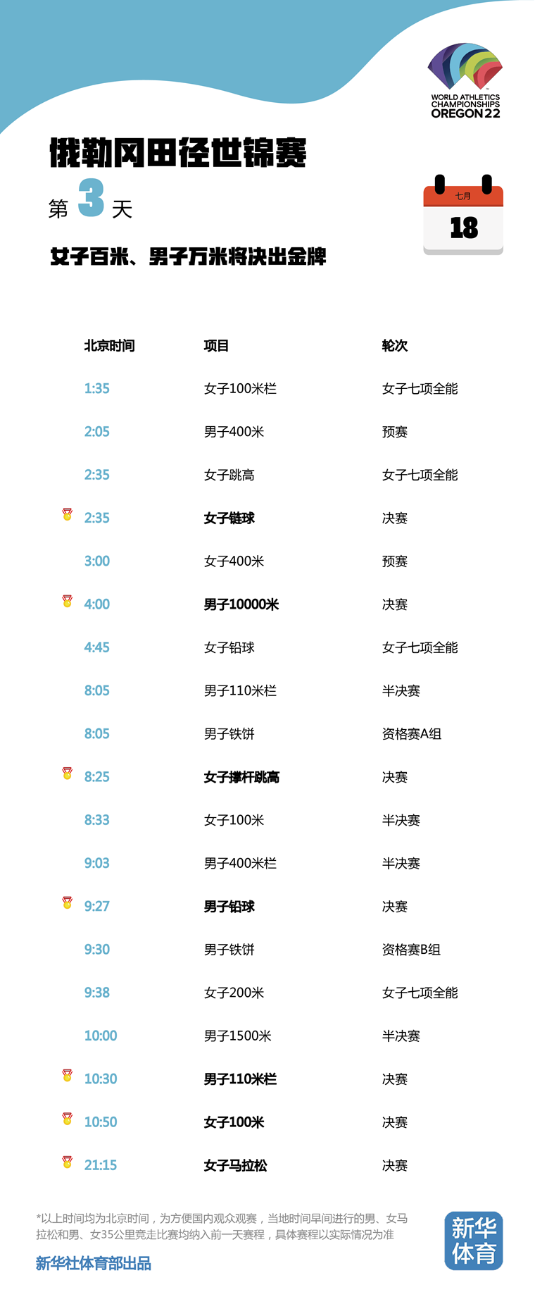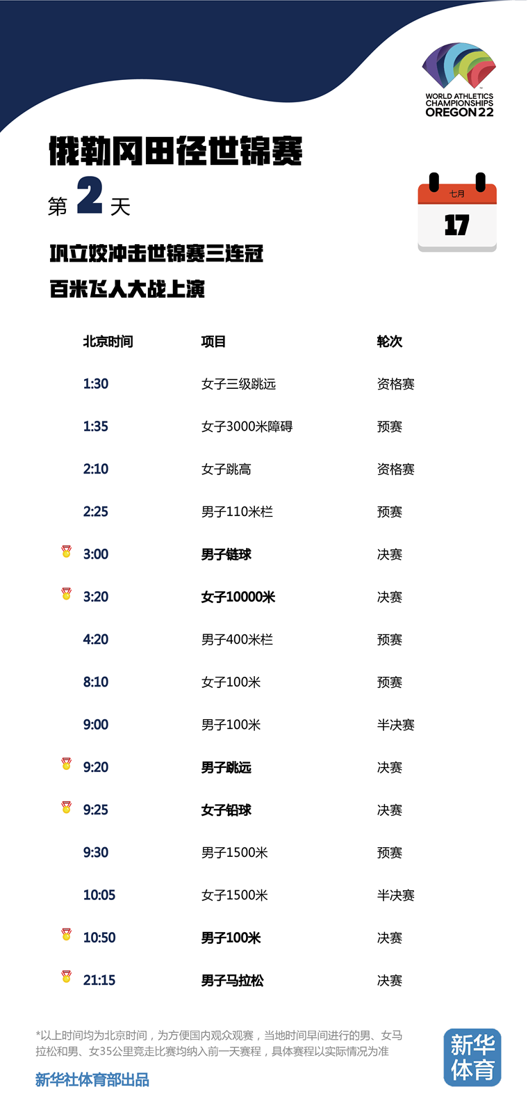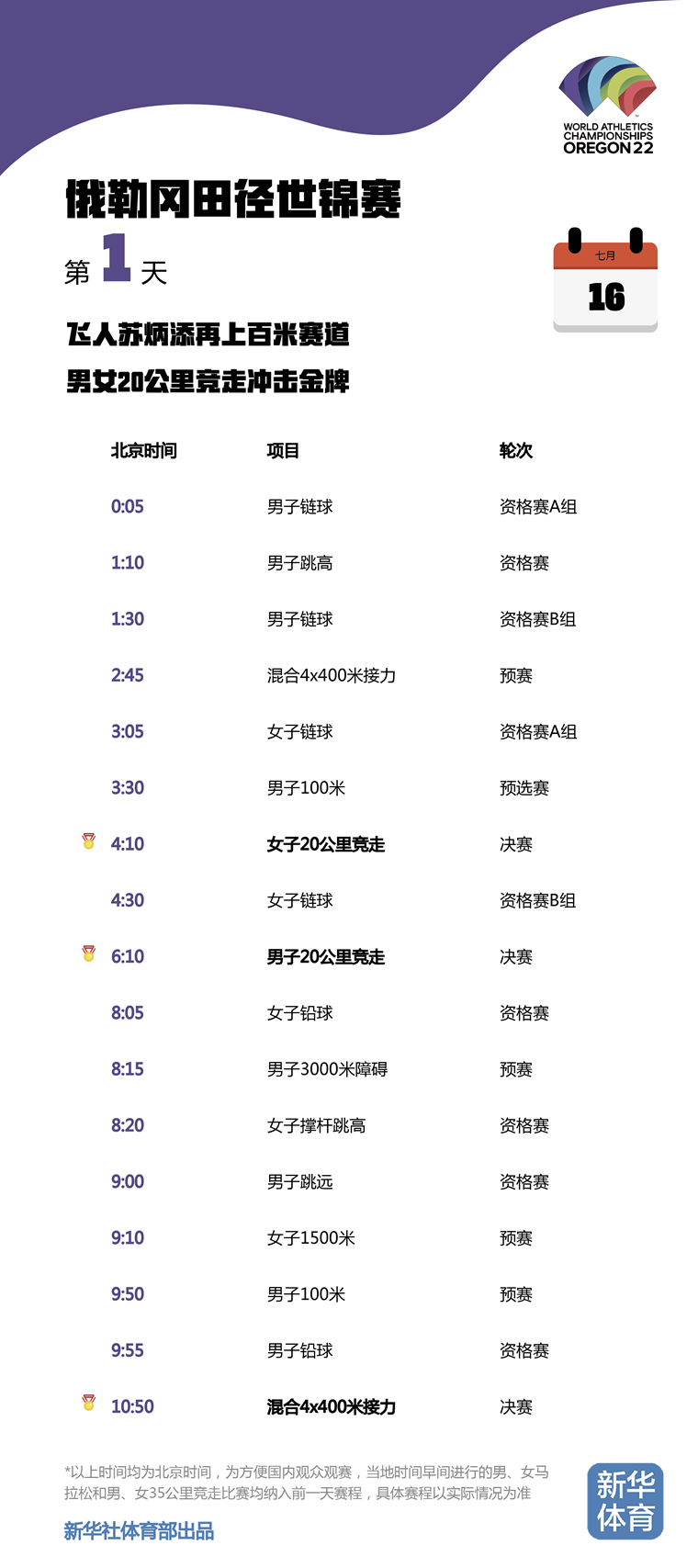 2022俄勒冈田径世锦赛将于当地时间7月15日至24日在美国俄勒冈州尤金市举行。由于比赛地与北京有15个小时的时差,为方便国内观众观赛,新华体育的小编们特意按照北京时间整理了一份世锦赛每日观赛时间表。日期、比赛时间统统都是北京时间!不用再去掰着手指头算时差,苏炳添、巩立姣等中国队名将每一轮比赛全部一目了然,快快收藏吧!