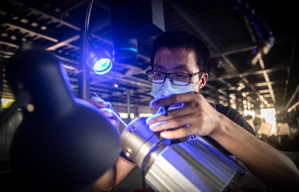 7月7日,在米朗科技有限公司生产车间,工人在对加工件进行激光焊接。新华社记者伍志尊 摄