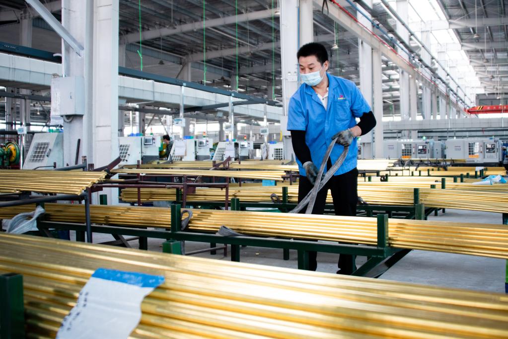 7月7日,在港利制冷配件有限公司生产车间,工人在运输加工材料。新华社记者伍志尊 摄