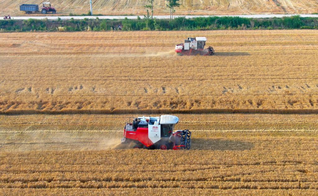 2022年6月8日,在河南省安阳市汤阴县菜园镇高标准农田示范区,收割机在麦田作业(无人机照片)。新华社记者郝源摄