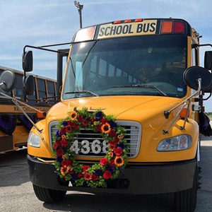 52辆巴士上的空座位,象征在2020年死于美国枪支暴力的4368名少年儿童。如果还活着,他们会和美国各地多数中小学生一样,会在校车上拥有一个座位,早上乘校车去学校,下午放学后坐校车回家。
