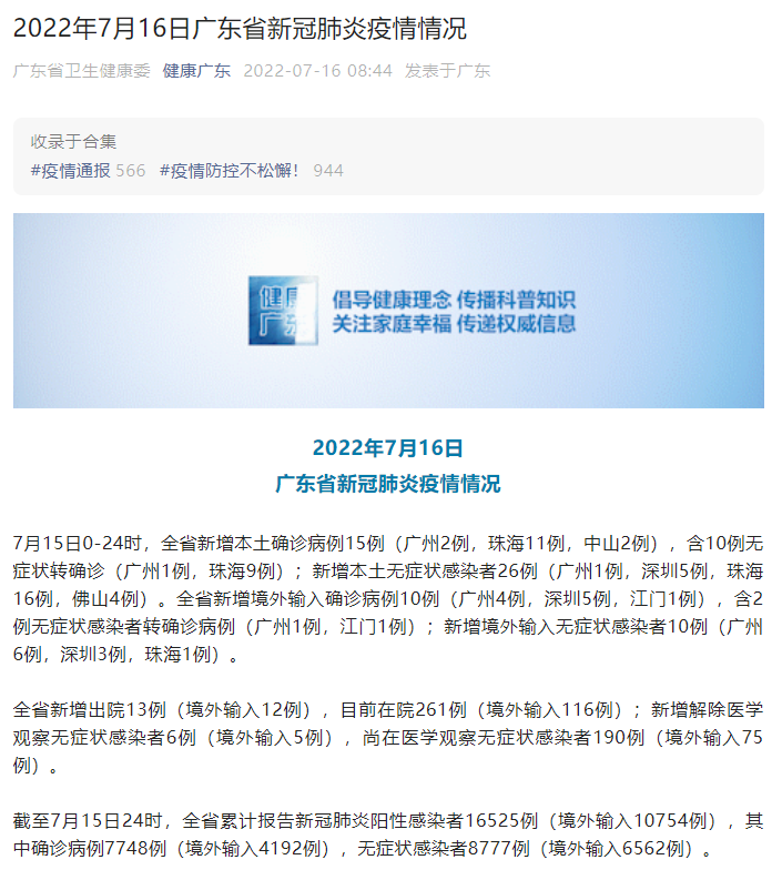 7月15日0-24时,广东省新增本土确诊病例15例(广州2例,珠海11例,中山2例),含10例无症状转确诊(广州1例,珠海9例);新增本土无症状感染者26例(广州1例,深圳5例,珠海16例,佛山4例)。全省新增境外输入确诊病例10例(广州4例,深圳5例,江门1例),含2例无症状感染者转确诊病例(广州1例,江门1例);新增境外输入无症状感染者10例(广州6例,深圳3例,珠海1例)。