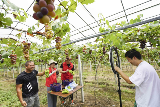 葡萄棚里,葡萄颗颗圆润饱满、酸甜可口。志愿者们通过直播的方式,助力农户增收。新华网发 温州市龙湾区永兴街道供图