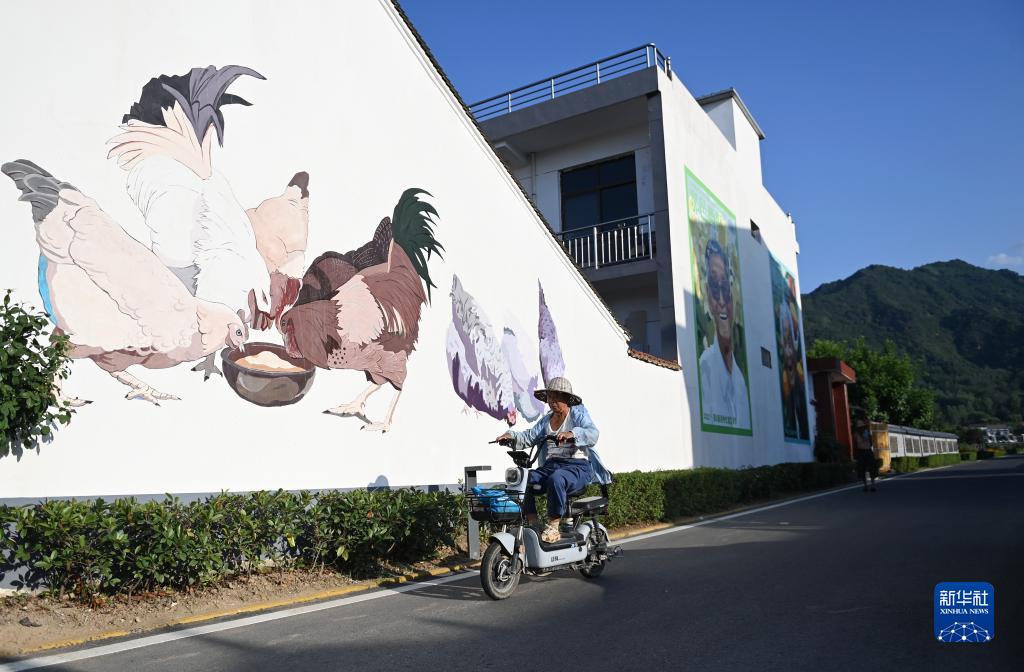 村民骑车经过西安市鄠邑区蔡家坡村的主题壁画(7月5日摄)。