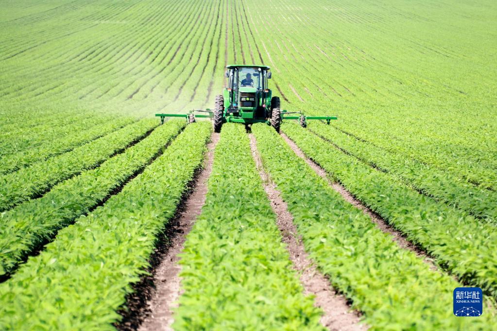 黑龙江北大荒农垦集团五大连池农场有限公司工作人员进行大豆中耕除草作业(2022年6月29日摄)。新华社发(陆文祥 摄)