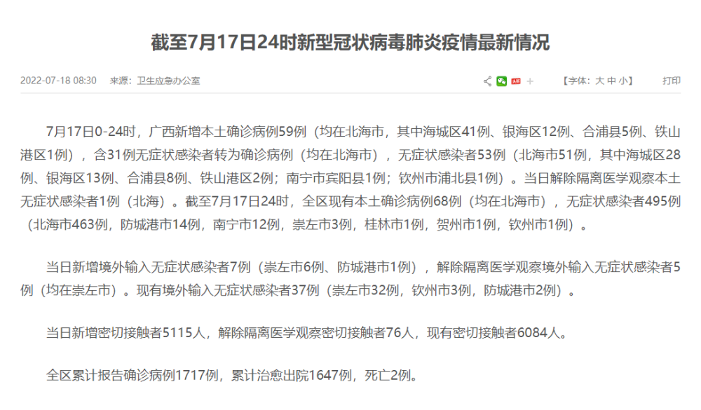7月17日0-24时,广西新增本土确诊病例59例(均在北海市,其中海城区41例、银海区12例、合浦县5例、铁山港区1例),含31例无症状感染者转为确诊病例(均在北海市),无症状感染者53例(北海市51例,其中海城区28例、银海区13例、合浦县8例、铁山港区2例;南宁市宾阳县1例;钦州市浦北县1例)。当日解除隔离医学观察本土无症状感染者1例(北海)。截至7月17日24时,全区现有本土确诊病例68例(均在北海市),无症状感染者495例(北海市463例,防城港市14例,南宁市12例,崇左市3例,桂林市1例,贺州市1例,钦州市1例)。