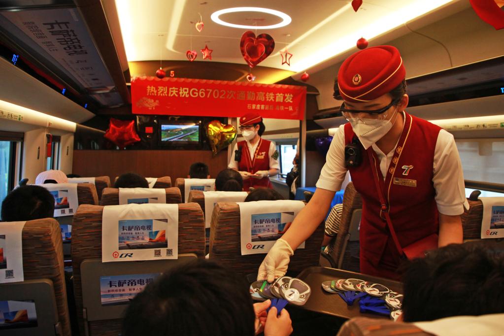 7月18日,乘务人员为乘客赠送首发纪念品。(受访单位供图)