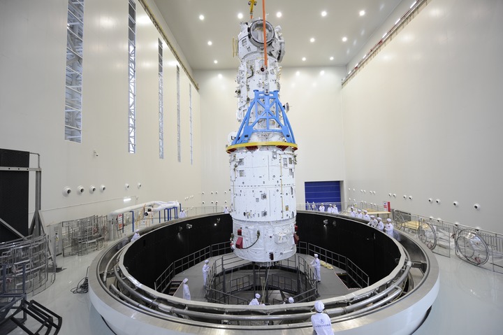 在中国航天科技集团五院天津基地内,天和核心舱在进行热试验前吊装(资料照片)。新华社发(航天科技集团五院供图)
