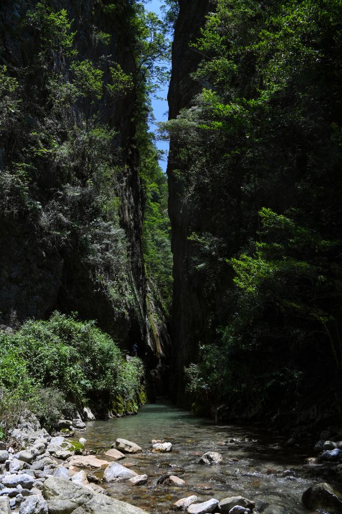 走走停停,记者沿途看到,峡谷里林木郁郁葱葱,山涧中溪流水声潺潺,小道旁退耕还林的坡地满是绿意。