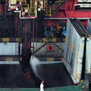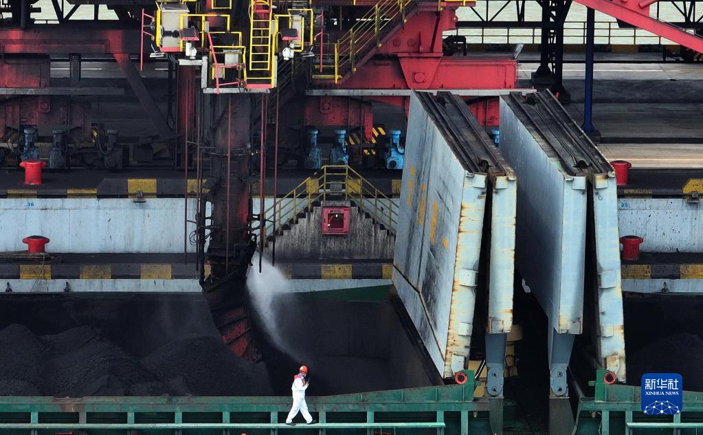 一艘轮船靠泊在唐山港曹妃甸港区煤码头装货(7月18日摄,无人机照片)。