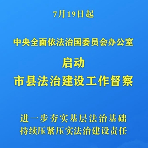 新华社北京7月19日电(记者白阳)19日,中央全面依法治国委员会办公室在京启动市县法治建设工作督察。督察聚焦地方推进法治建设等情况,进一步夯实基层法治基础、持续压实压紧法治建设责任,加快推进市县法治政府建设。