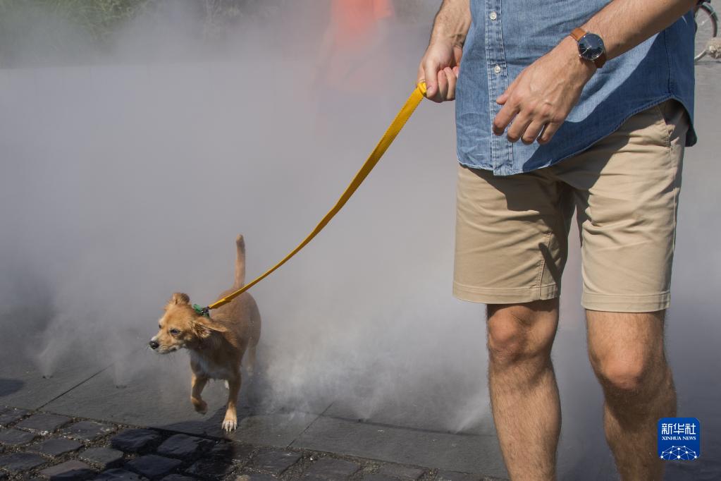 7月19日,在匈牙利布达佩斯,一条小狗和它的主人在一处公共加湿设施享受清凉的喷雾。新华社发(弗尔季·奥蒂洛摄)