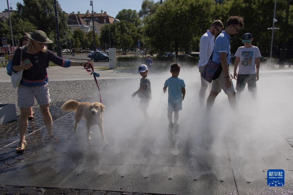 7月19日,在匈牙利布达佩斯,人们在一处公共加湿设施享受清凉的喷雾。新华社发(弗尔季·奥蒂洛摄)