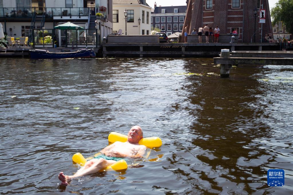 7月19日,在荷兰哈勒姆,一名男子躺在水中消暑。新华社发(西尔维娅·莱德雷尔摄)