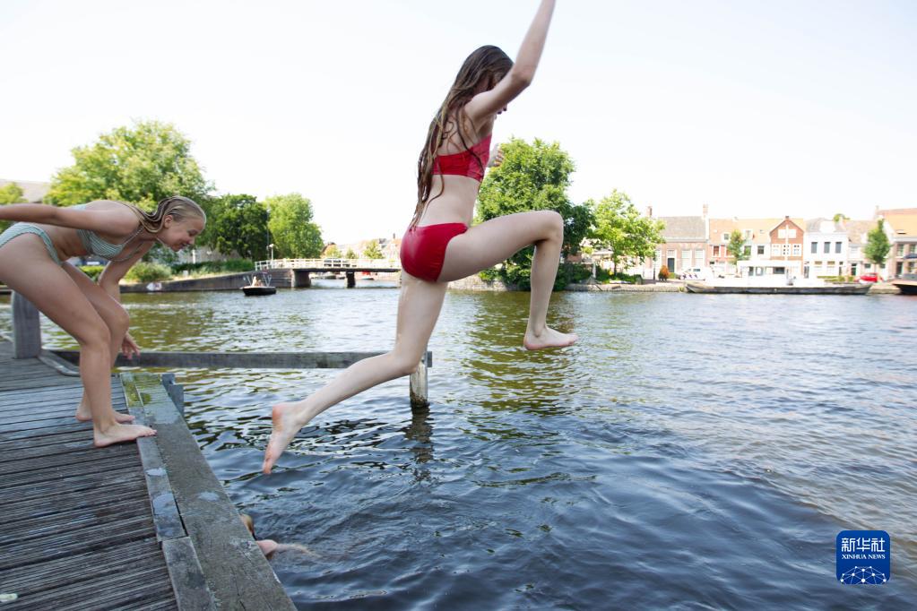 7月19日,在荷兰哈勒姆,一名女孩跳向水中消暑。新华社发(西尔维娅·莱德雷尔摄)